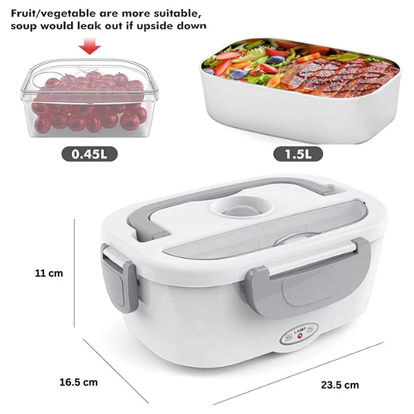 Този отопляем контейнер за обяд включва два подвижни контейнера с вместимост 1,5 л и пластмасов контейнер с вместимост 0,45 л, които могат да се използват взаимозаменяемо.