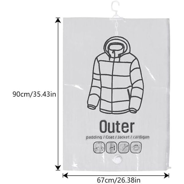 Увеличете максимално пространството в гардероба си, като го поддържате подреден през всички сезони. Използвайте тези висящи компресируеми торби за съхранение на големи, обемисти или остарели костюми, рокли, дебели жилетки, якета и палта в гардероба си. Нашите вакуумирани торби за съхранение предпазват дрехите ви от вода и миризми, което ги прави идеални за дългосрочна употреба.