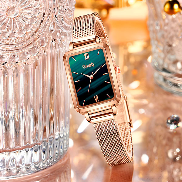 Този часовник има лъскав розово-златист цвят и красив зелен циферблат. Добавя стил към всяка рокля, дънки или официално облекло.