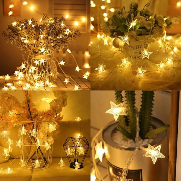 Светодиодните звездни нанизи могат лесно да се поставят или окачват на стени, прозорци, врати, подове, дървета, пиана, градини и др. Можете да ги използвате, за да декорирате в любимата си форма и стил. Чудесни са за добавяне на изблик на успокояващ цвят в спалнята на дете или тийнейджър или дори в общежитието на колежа. Също така можете да ги окачите над веранда, врата, прозорец, табла за външен блясък – или да ги използвате като декорация за стена.