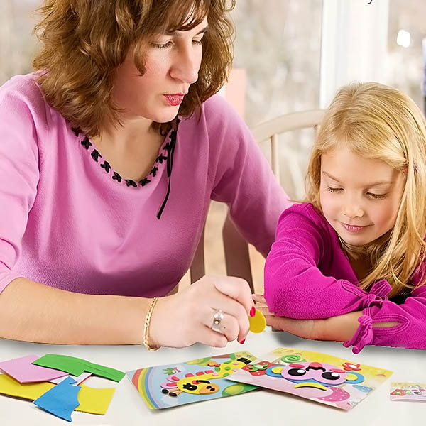 Не се изисква лепило или ножица, така че не е нужно да се притеснявате, че детето ви ще се нарани. Просто отлепете лепилото и го залепете върху картона слой по слой според подсказващата картинка.