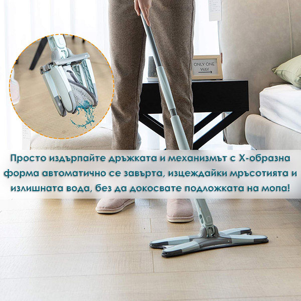 Забравете за мокрите мопи и мръсните ръце! Нашата усъвършенствана система за самостоятелно изцеждане имитира изстискване с ръка, премахвайки 2 пъти повече вода от традиционните мопи за по-бързо и лесно почистване!